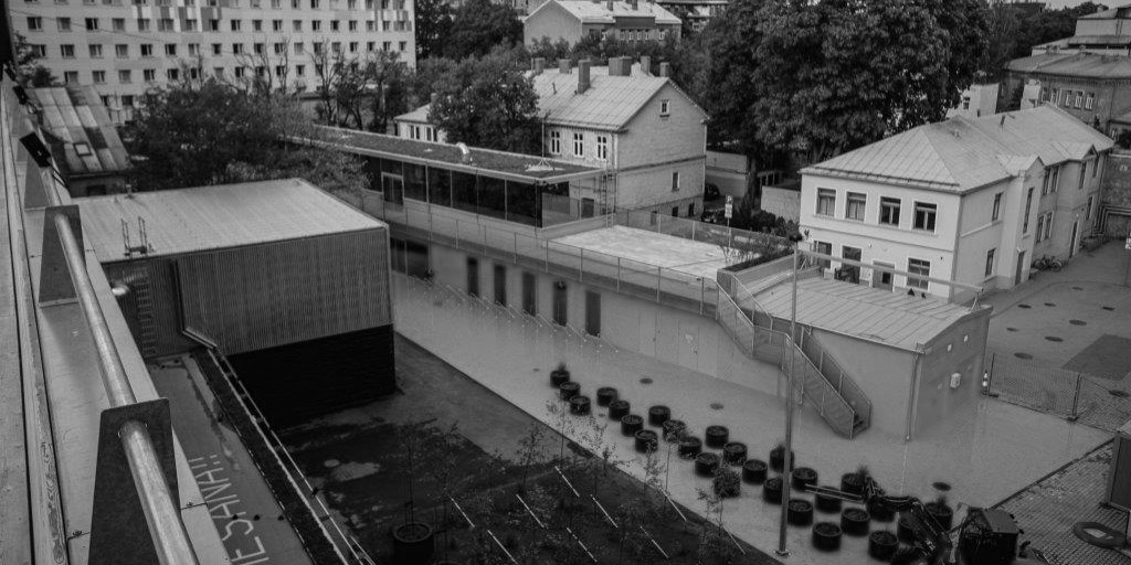 Velosipēdu novietne atrodas Tabakas fabrikas iekšpagalmā.